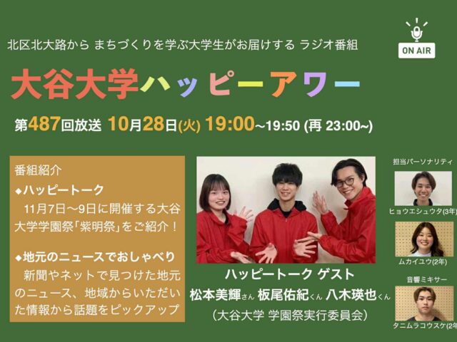 この番組は、大谷大学で、まちづくりを学ぶ学生が、 大学のある北区から楽しく、 役に立つ様々な情報をお届けしています。 番組のメインコーナーは、 北区でお仕事や地域活動に取り組む方から、地域の魅力や、 取り組みへの想いうかがう「ハッピートーク」。